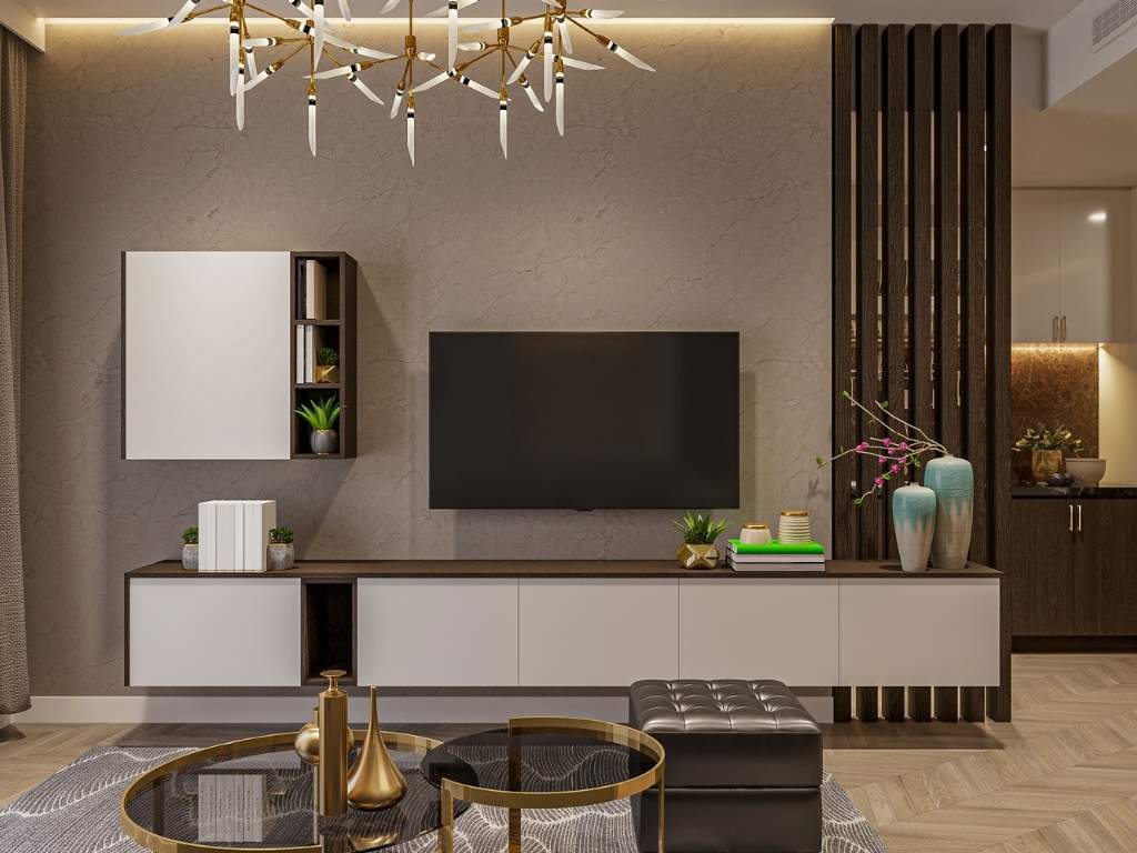 Wall-mounted TV units save floor space and offer a sleek, clutter-free design that is ideal for compact or modern homes. These units hide unsightly wires while providing floating shelves or cabinets for extra storage. Their minimalist appeal and functional design make wall-mounted units create a clean and polished look that raises the aesthetic appeal of your living room.