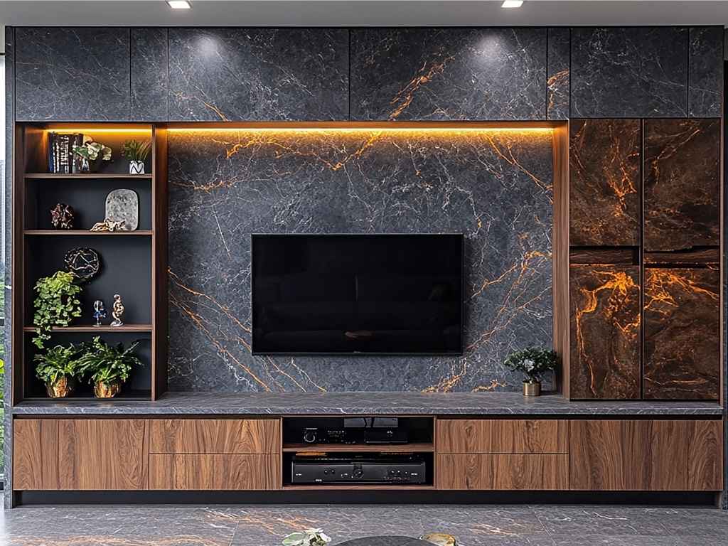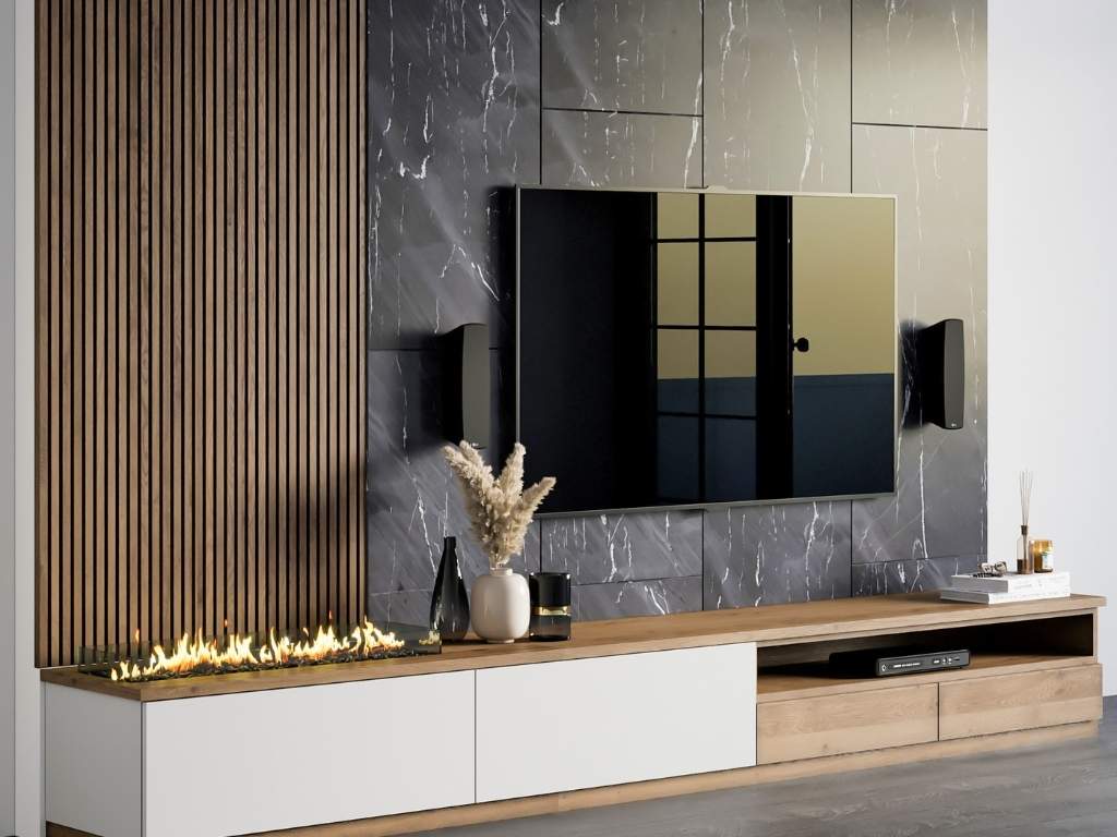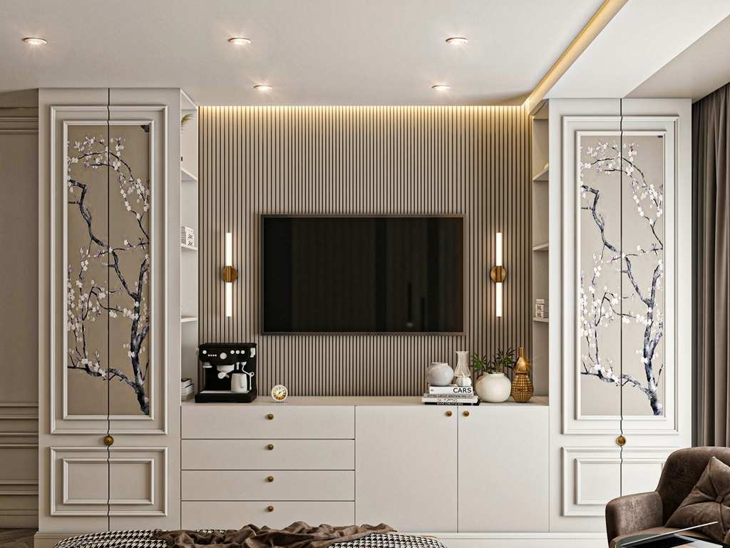 Paneling settings are an ideal combination of luxury and functionality: they add elegance to your background while watching the TV with textured finishes, wood panels, or even fabric accents. It is usually enhanced with integrated lighting that adds depth and drama to the space. Concealed storage, decorative shelves, or ambient features can also be included in paneling, which is the perfect statement piece for a sophisticated and stylish living room.